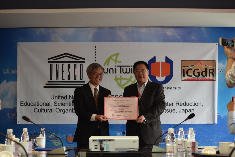 UNITWIN/UNESCO Chair项目基于联合国教科文组织(UNESCO)第26届大会决议于1992年正式成立。该项目旨在通过建立高校网络和鼓励高校间合作从而促进高等教育在研究、培训和课程项目体系等方面的发展,增强国际高校和科研机构的教育和科研能力。目前,该项目在自然科学领域全球共有170个教席。联合国教科文组织地质环境灾害减灾教席项目(UNESCO-Chair on Geoenvironmental Disaster Reduction)是面向地质环境灾害的UNITWIN/UNESCO Chair之一,该教席致力于推进全球地质环境灾害减灾方面的教育和科研合作。