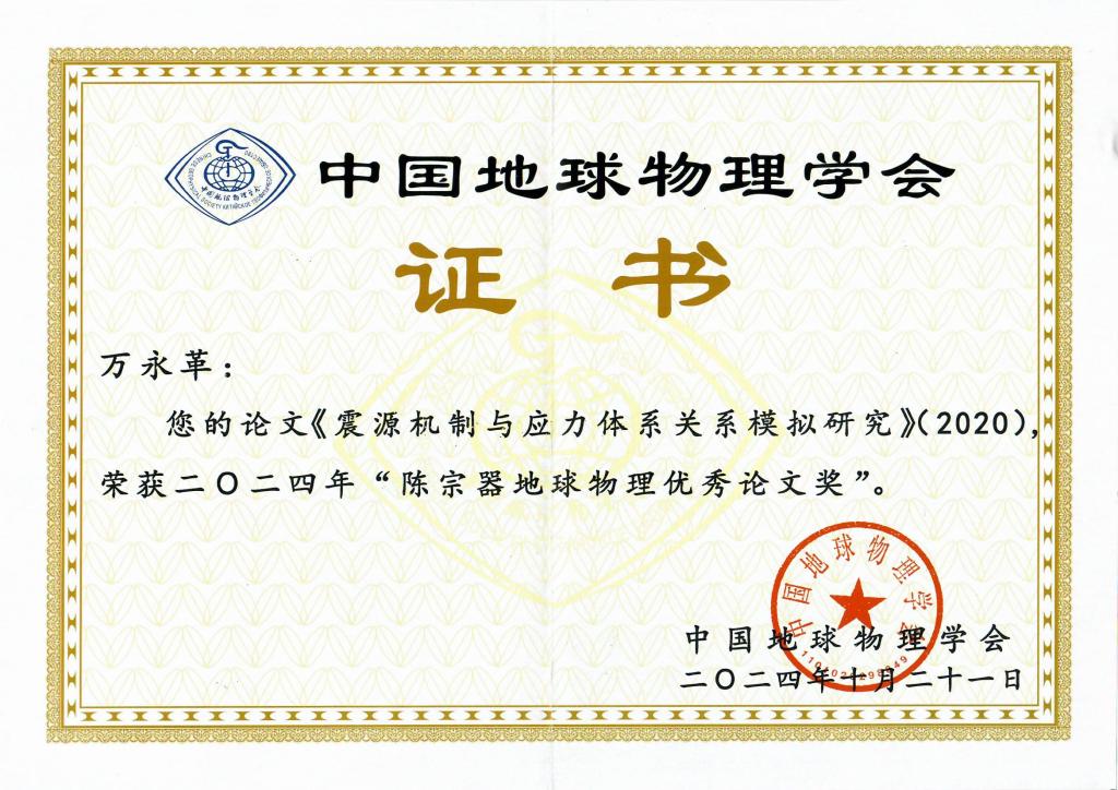 2024年10月21日,中国地球物理学会第十一届三次理事扩大会暨中国地球物理学会颁奖典礼在厦门国际会展中心隆重举行。kaiyun官网kaiyun体育网页登录入口万永革研究员(唯一作者)于2020年6月在SCI期刊《地球物理学报》发表的文章《震源机制与应力体系关系模拟研究》荣获2024年“陈宗器地球物理优秀论文奖”。该论文首次系统研究了地震震源机制和所作用的地壳应力场之间的关系,模拟了东西向挤压、垂直向拉张的挤压应力体系,南北向挤压、东西向拉张的走滑应力体系和垂直向挤压、东西向拉张的拉张应力体系所产生震源机制及其剪应力和正应力的表现。
