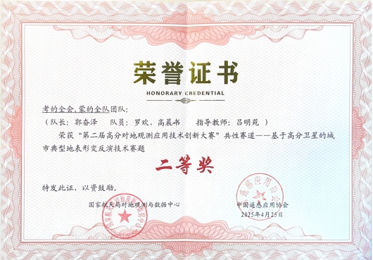 4月22-23日,第二届“高分对地观测应用技术创新大赛”决赛在上海市同济大学举办。kaiyun官网由吕明苑老师担任指导教师,郭奋泽(队长)、罗欢和高晨书三名同学组成的参赛团队获得二等奖。