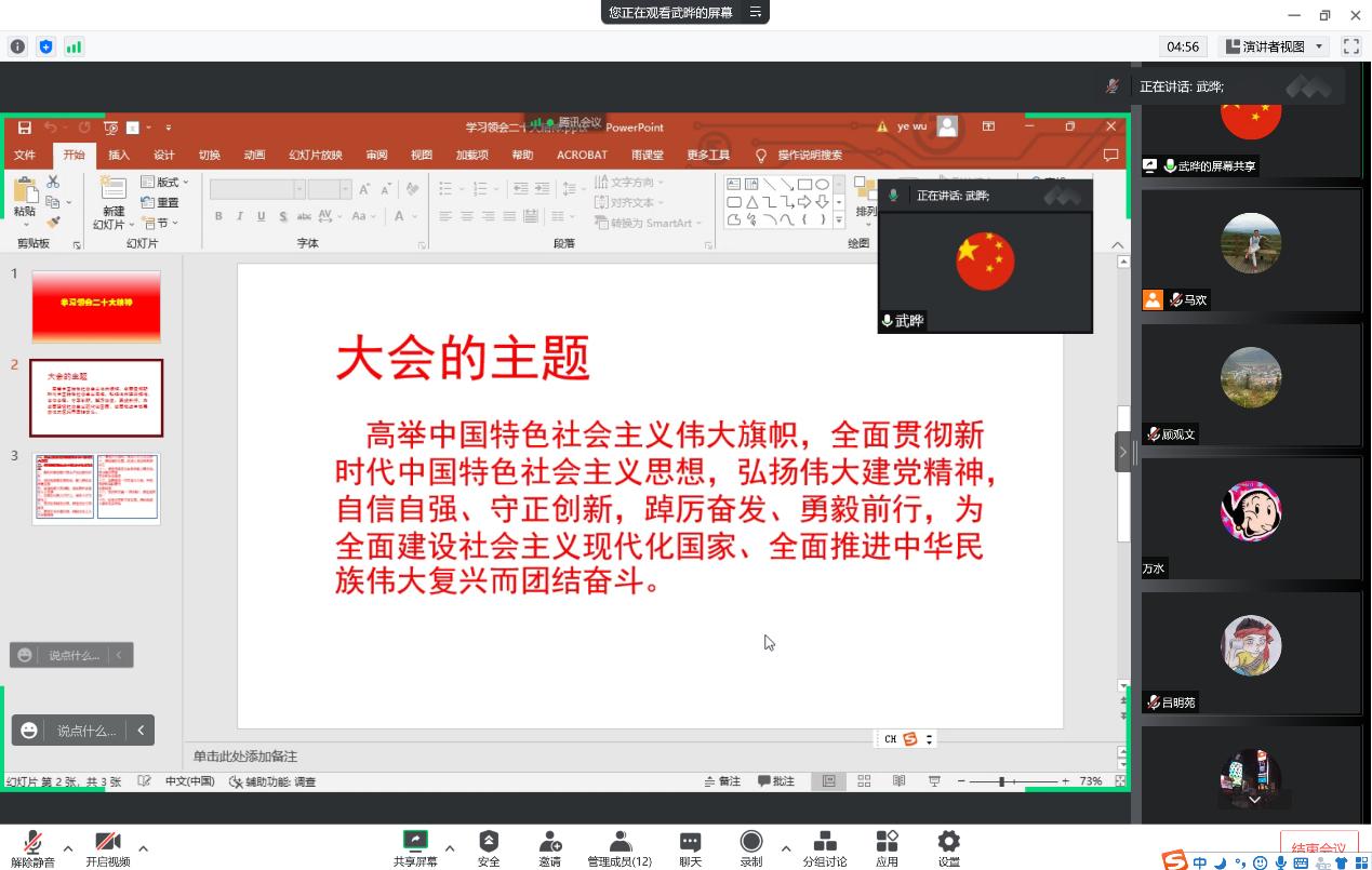 2022年11月17日下午,地震监测与地球探测党支部组织支部全体党员在线上集中学习了党的二十大精神。本次党日学习活动由支部书记马欢同志主持,武晔同志主讲,全体支部成员参与。