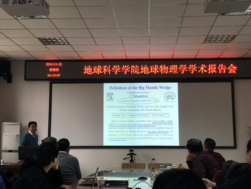 报告会上,雷建设研究员详细讲解了“大地幔楔”模型的概念,并展示了我国东北地区“大地幔楔”模型和青藏高原东缘“大地幔楔”模型的最新研究成果。报告会后,雷建设研究员与到会师生进行了深入交流。