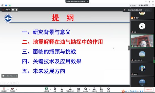 张丽艳教授为大家介绍了宽方位地震的概念、宽方位地震处理技术,并结合大量工作实例及图片详细讲授了宽方位地震的应用以及宽方位地震发展方向。李昂教授为大家介绍了非常规油气地震解释的研究背景和意义、地震解释在油气勘探中的作用,同时以松辽盆地油气预测为例,详细介绍了地震解释面临的瓶颈与挑战以及非常规油气地震解释关键技术的应用及其效果。会后,张丽艳教授和李昂教授与参会师生就地震勘探及地震解释等相关问题进行了交流与探讨。